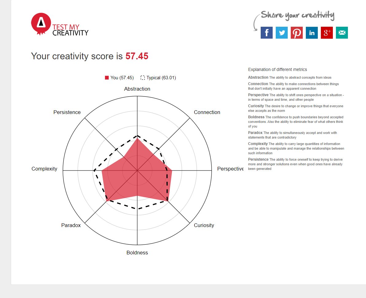 Snapshot of my Creativity Test Results from TestMyCreativity