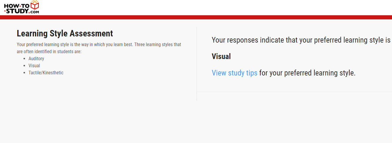 How-to-study.com n.d., Learning Style Self-Assessment, how-to-study.com, viewed 17 March 2021, <https://www.how-to-study.com/learning-style-assessment/quiz-result.asp?sg=7C8DB35214873BEC064E-4001-4B91-9448-50DE325E61C9AAEB03B8-A938-4DBC-A0E2-C989D5531E95ECEDA516-87F0-4E5A-93A1-90EEC18FA6A91507CF02-76AD-4268-8480-29967930B0E8>.