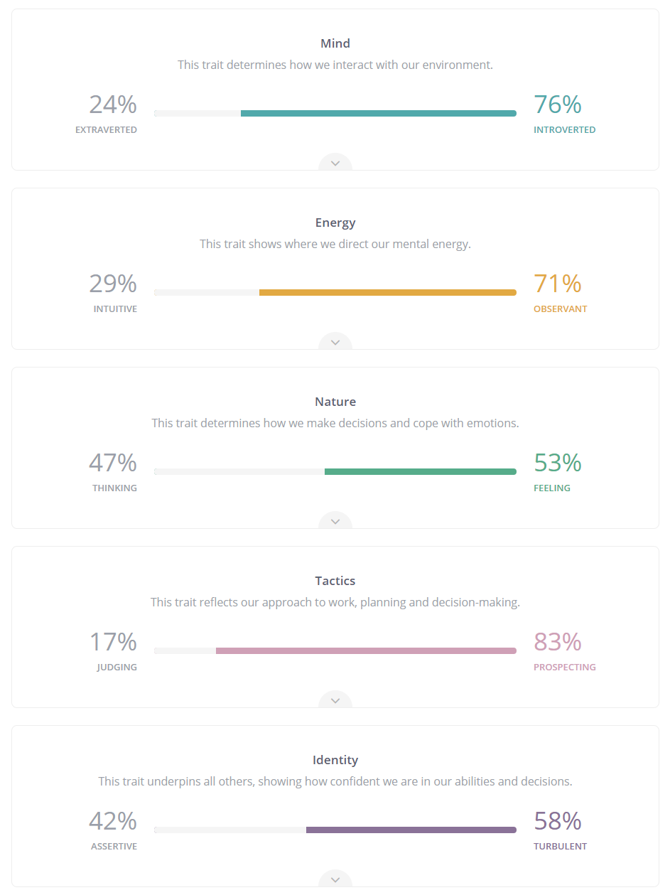 I have not written a lot about these tests because I honestly do not think too much of them. I do not believe the results mean anything useful. You cannot develop a critical opinion about someone based upon a generic online test.