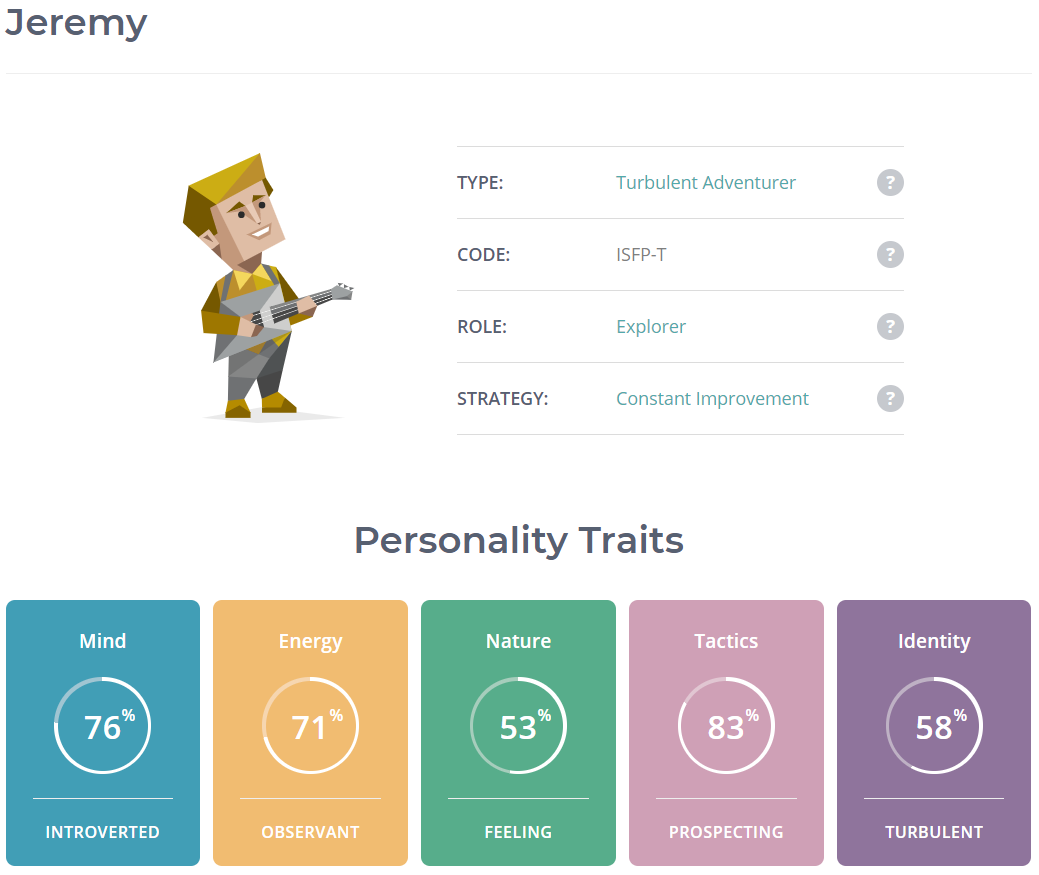 16peronalities.com n.d., Jeremy – Turbulent Adventurer (ISPF-T) 16Personalities, 16Personailites, viewed 17 March 2021, <https://www.16personalities.com/profiles/6a9be93cb9f72>.